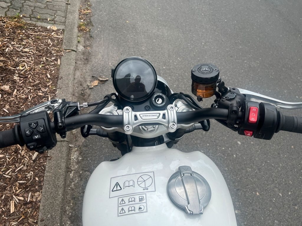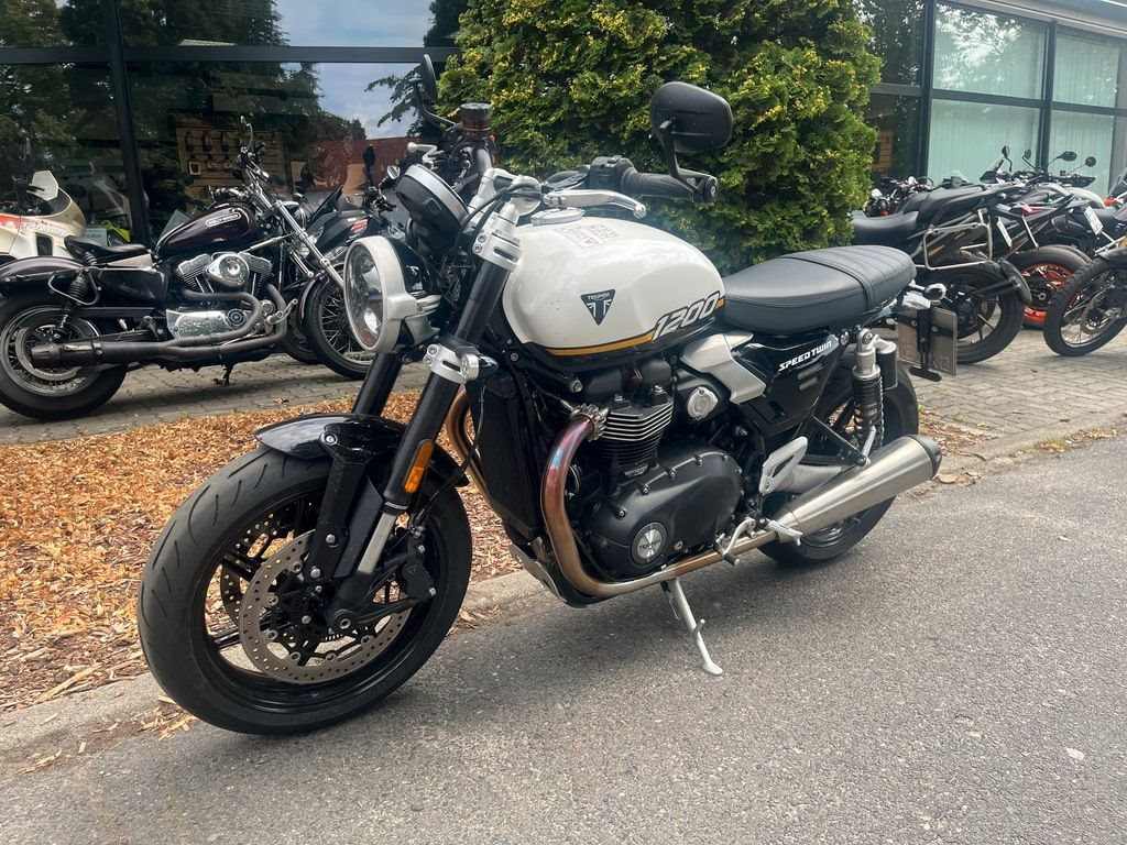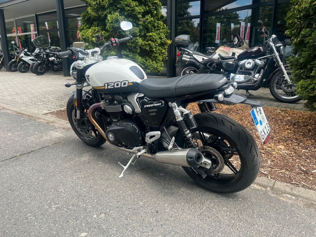 Mit den neuen Speed Twin 1200-Modellen bietet Triumph zwei außergewöhnliche Maschinen, die Retro-Optik und moderne Technik ansprechend kombinieren. Der potente 1200er Paralleltwin trifft nun auf State-of-the-Art Elektronik.und verwöhnt mit einem herrlichen Sound. Die Standard-Speed Twin überzeugt mit einer entspannten Ergonomie. Der breite, höher positionierte Lenker und die niedrigeren Fußrasten sorgen für eine aufrechte Sitzhaltung. Auf der Standardvariante sind alltagstaugliche Fahrwerks- und Bremskomponenten verbaut, die in den meisten Situationen vollkommen ausreichen.